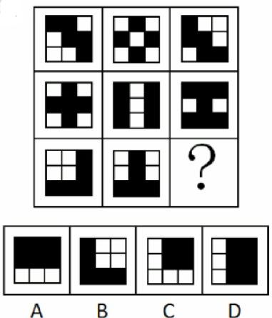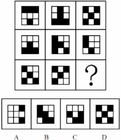 选项左上角颜色不同,对应第三行左上角图1黑+图2黑,第二行中间方块和右下角方块都是黑+黑=白,所以“?”处图形的左上角应是白色,排除B、D项。